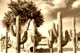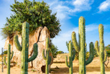 Cacti grow in steppe. Hot nature. Flora of arid regions. Spiny cacti near small rock. Summer landscape. Cacti grow under blue sky. Cactuses in sultry reserve. Deserted arid desert.