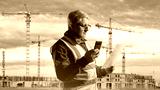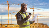 Man builder with documents. Phone in architect hand. Construction cranes behind engineer. Portrait builder making call. Gray-haired architect in yellow vest. Man foreman near construction landscape