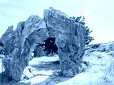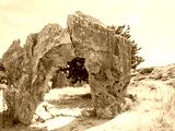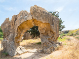 Landscape on Cyprus. Stone arch in Paphos. Archaeological museum. Stone arch at Cyprus island. Ancient sights of Paphos. Landscape of museum of tombs of kings. Tour of tomb of kings complex Cyprus