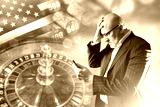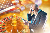 Man lost in online casino. American with tablet near table for playing roulette. Man plays in casino using gadget. Frustrated gambler. Guy lost in electronic casino. Failure, bad luck