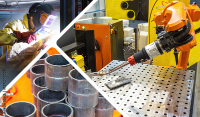 Welding work at industrial enterprise. Hot welding of steel pipes. Man welder in protective mask. Automated soldering machine. Welding technologies. Robot with built-in soldering machine