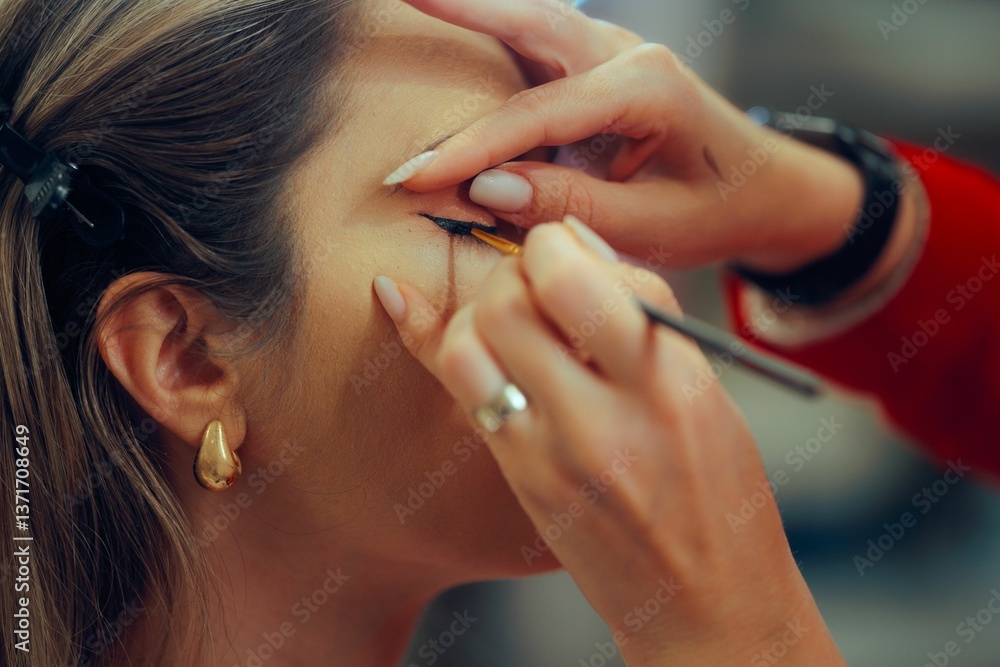 Hand of a Makeup Artist Applying Winged Eyeliner with Brush. Woman wearing perfect eye makeup for everyday casual fashion look