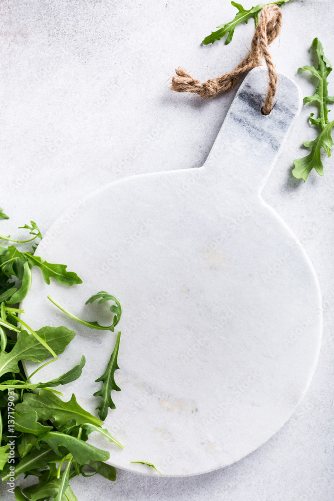 Background with green fresh rucola and marble cutting board on light gray stone table. Healthy food concept with copy space. Top view.