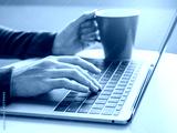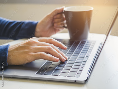 Woman hand type on Laptop Keyboard with Coffee cup Morning light