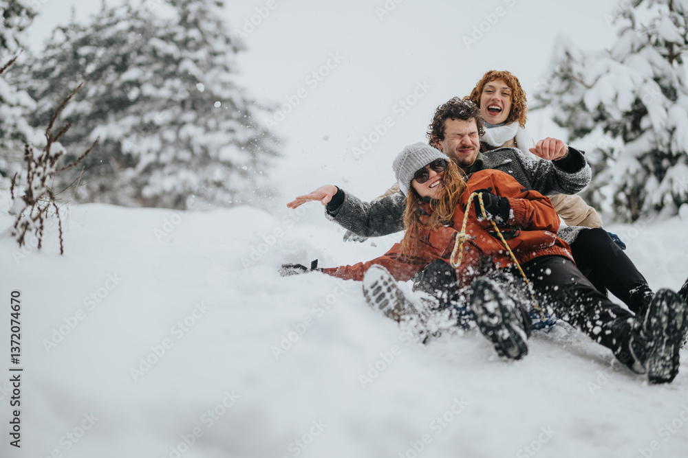 Three friends sledding down a snowy hill in the forest, radiating joy and togetherness while enjoying winter fun outdoors surrounded by snow-covered trees and the beauty of a cold winter day.