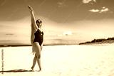 Beautiful middle aged woman standing holding scarf on white sandy beach in summer. Side view
