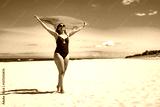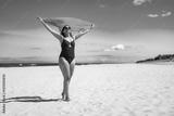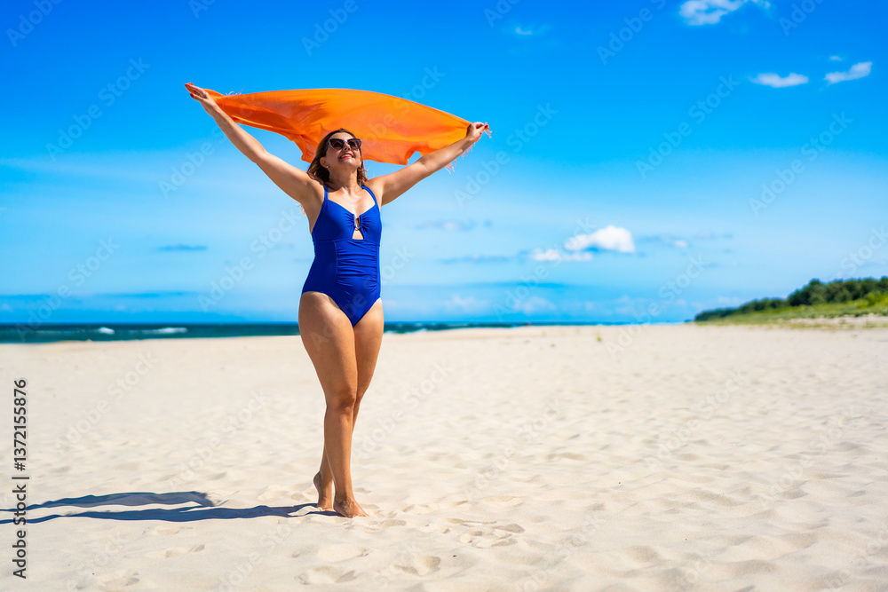 Beautiful middle aged woman standing holding scarf on white sandy beach in summer. Front view
