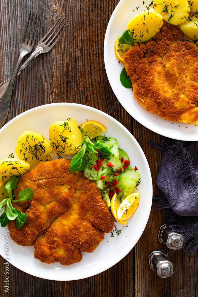 Crispy breaded seared chicken cutlet with boiled potatoes and fresh cucumbers served on wooden table