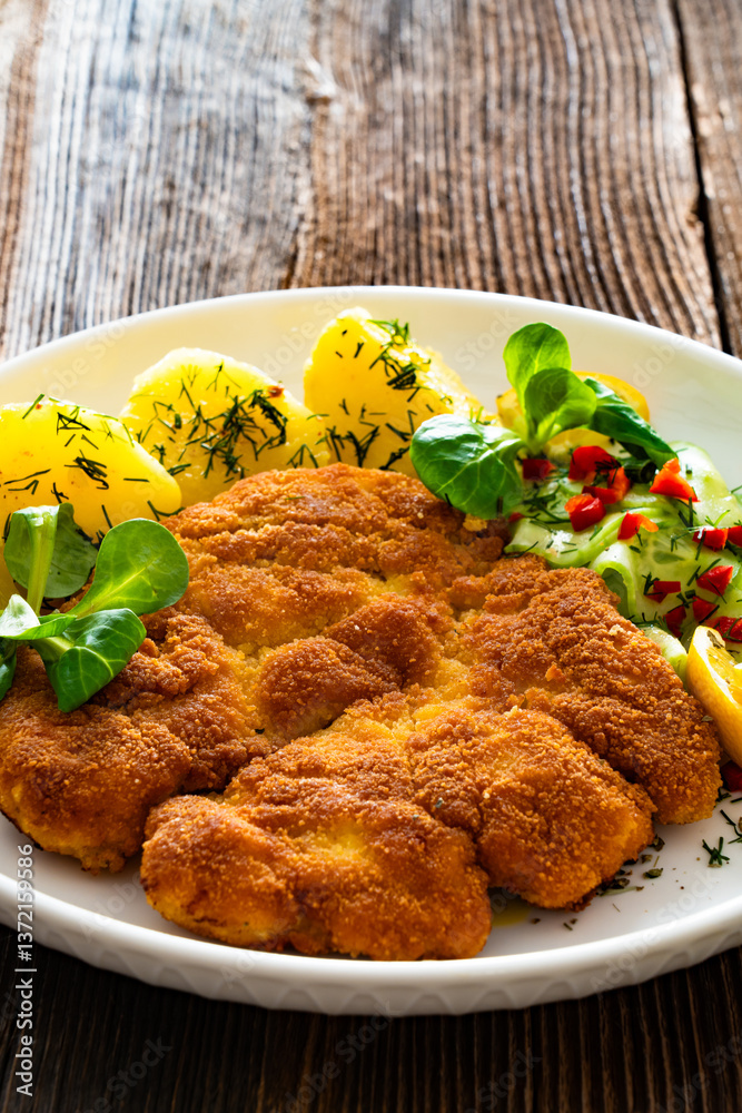 Crispy breaded seared chicken cutlet with boiled potatoes and fresh cucumbers served on wooden table