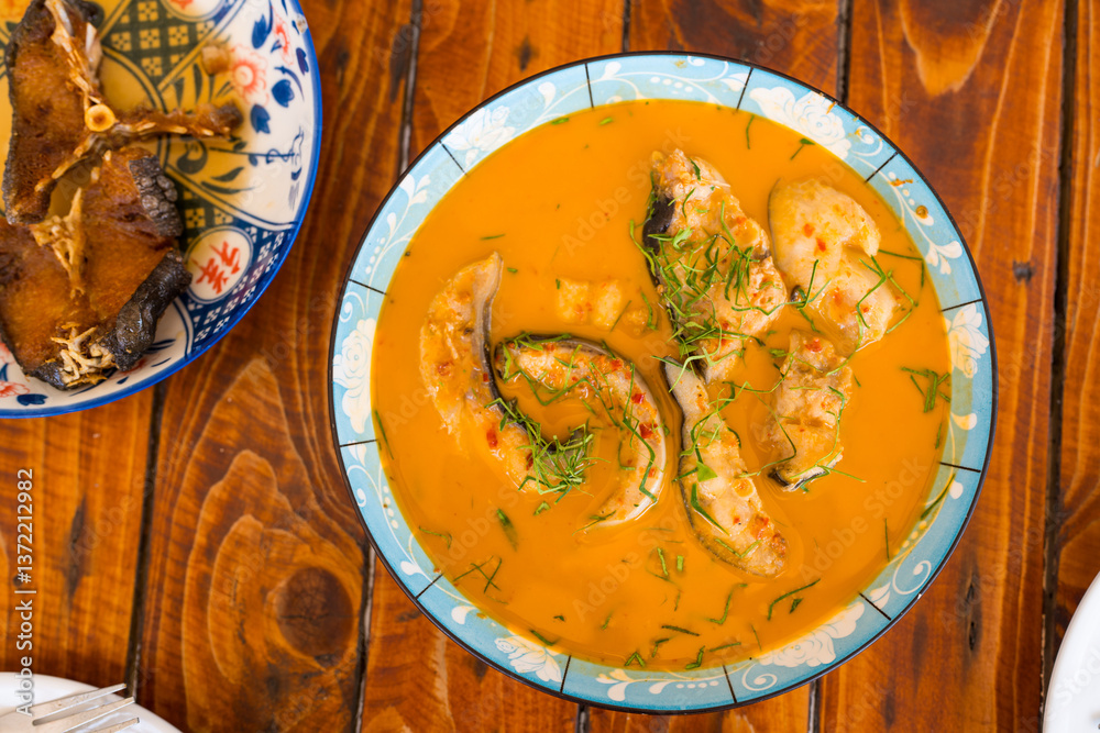 Thai traditional food boiled fish with red curry spell with chu chee pla on top table
