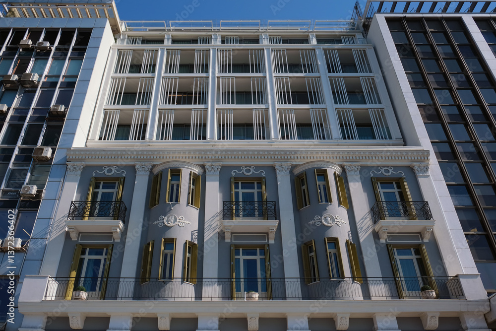 Street view with facade of buildings in the center of Thessaloniki, the second-largest city in Greece.