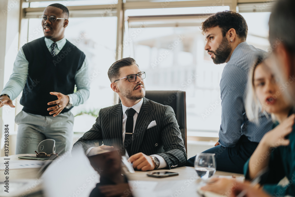 A diverse group of business people in a modern conference room engaged in a lively meeting. The team demonstrates cooperation, leadership, and effective communication in a corporate environment.