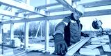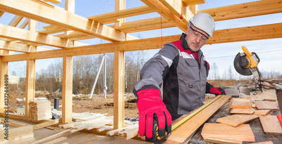 Construction worker in safety gear measures wood planks at a building site with a wooden house frame and circular saw in the background.