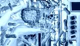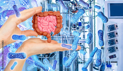 Intestine in hands. Microbiome of digestive system. Probiotic treatment. Probiotic cells for immunity. Digestive health. Studying action of probiotics. Bioreactor for microbiology