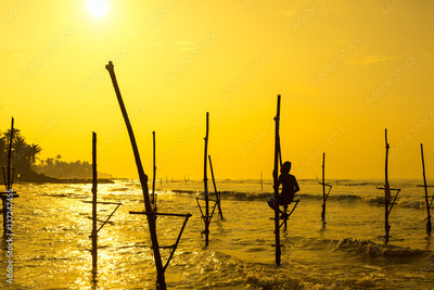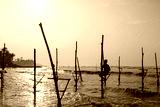 Sri Lanka's traditional Fisherman on sanset. Fishing on silt is very common in many Asian countries but most of all - in Sri Lanka