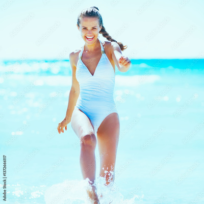 Happy young woman playing with water at seaside