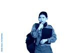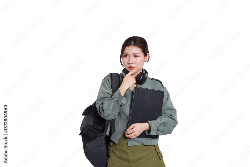 Portrait of Asian female student wearing backpack, headphones, fashionable clothes, holding laptop, posing dynamically on white background