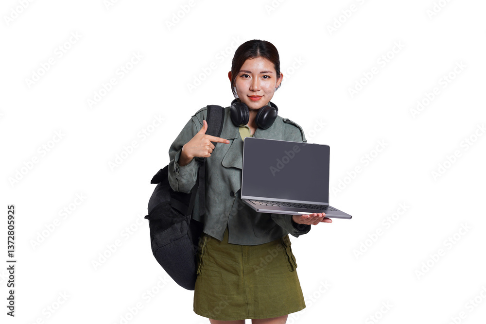 Portrait of Asian female student wearing backpack, headphones, fashionable clothes, holding laptop, posing dynamically on white background