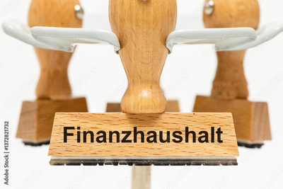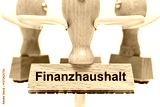 In einem Stempelhalter hängt ein Holzstempel mit der Aufschrift Finanzhaushalt