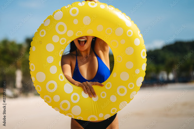 Smiling young asian woman enjoys every moment of her tropical escape, playing on the beach