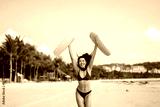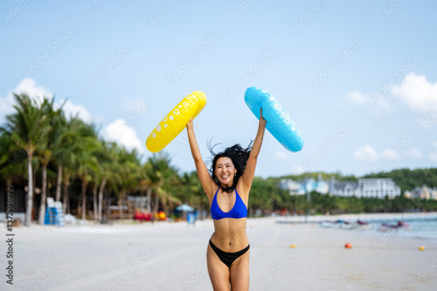 Smiling young asian woman enjoys every moment of her tropical escape, playing on the beach
