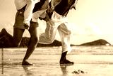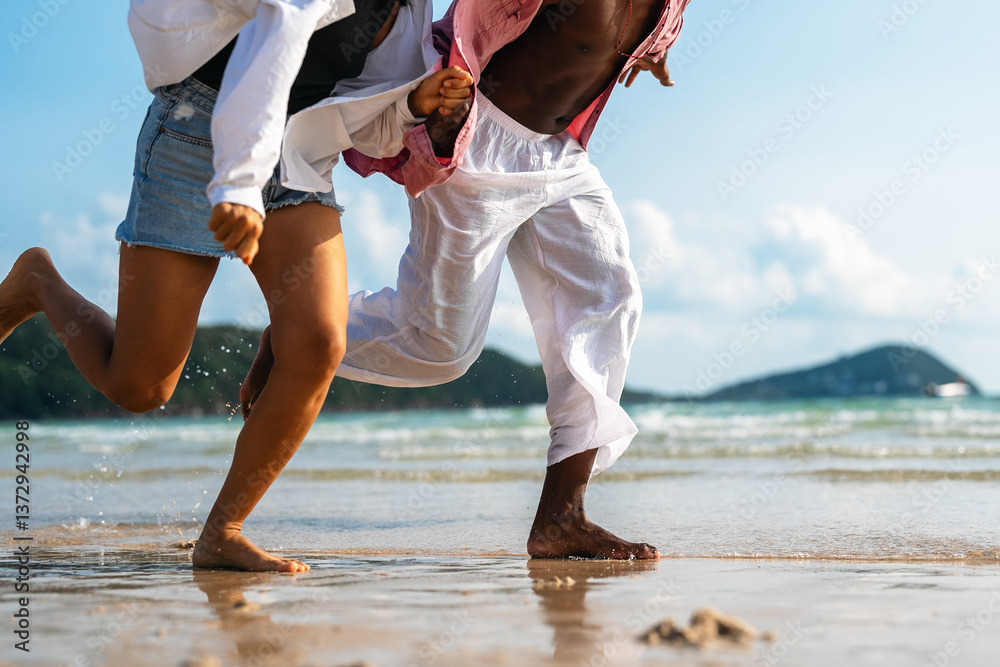 Passionate summer love on a tropical beach, young interracial couple enjoying adventure, laughter