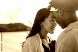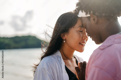 Carefree couple enjoying a tropical beach vacation, laughing making unforgettable memories together