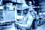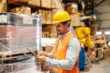 Interracial smiling storage manager scrolling on tablet and tracking shipment on online app.
