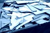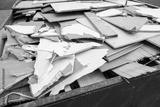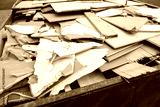 heap of shattered drywall and gypsum decorations is removed as construction waste. Broken building tiles and debris are collected in a container during renovation