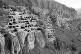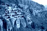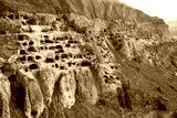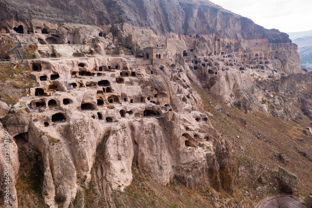 Impressive view of caves of Vardzia monastery complex carved in crag, one of main landmark of southern Georgia