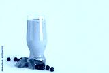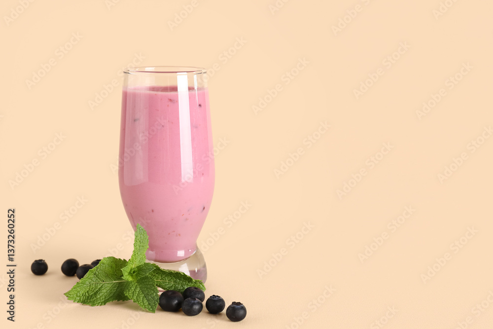 Glass of fresh blueberry smoothie with mint and berries on yellow background