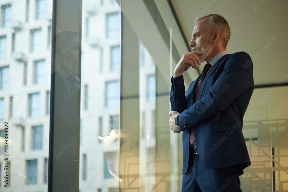 Medium side view shot of pensive mature Caucasian executive wearing suit looking out of window, copy space