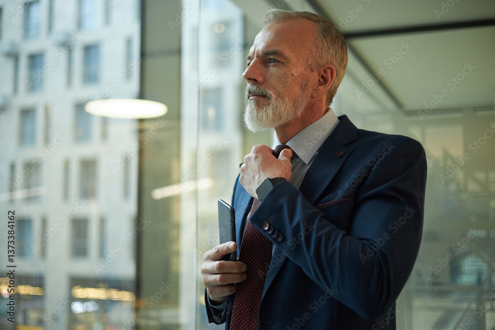 Medium shot of middle-aged Caucasian businessman wearing formal suit, adjusting his tie, while standing in office