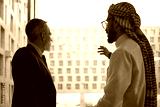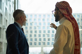 Two ethnically diverse mature and young businessmen looking out of office window while discussing new construction project