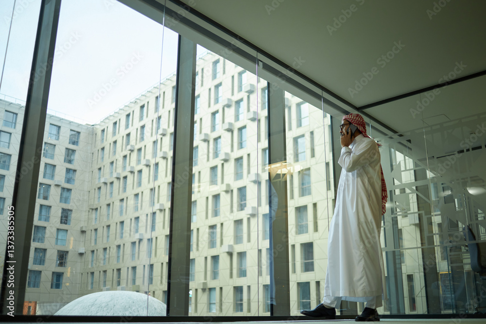 Low angle view wide shot of young Middle Eastern businessman looking out of panoramic window while having phone call, copy space