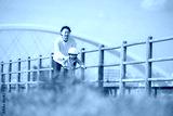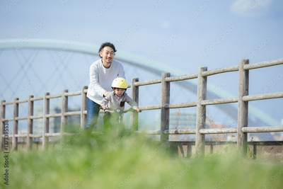 青空の河川敷で川沿いで自転車の練習をする子どもと父親 がんばれ~