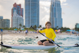 Summer vacation with kids in Miami beach. Kid and Summer sea. Child boy paddling on paddle board or sup. Summer lifestyle. Summer Water sport. Kid Boy swimming with paddle board.