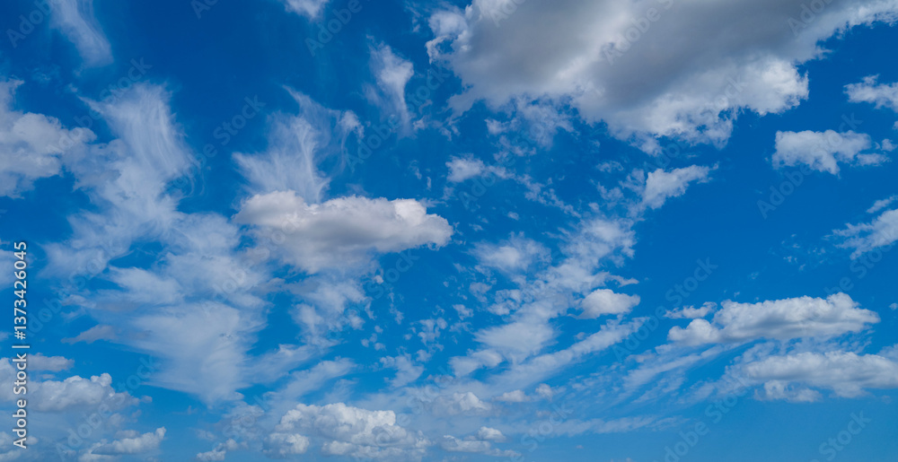 Background with clouds on blue sky. Sky view. Beautiful sunny sky. Clouds on blue sky. Sun shining through the puffy clouds.