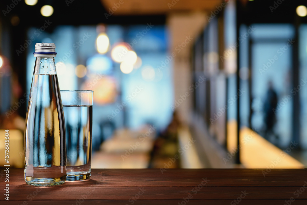 A bottle of water and a drinking glass on the wooden table in cafe.
