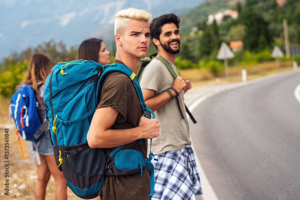 Cheerful interracial friends standing on road showing hitchhiking gestures. Tourism traveling