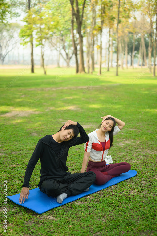 Athletic couple stretching while exercising together in a peaceful park. Healthy lifestyle concept