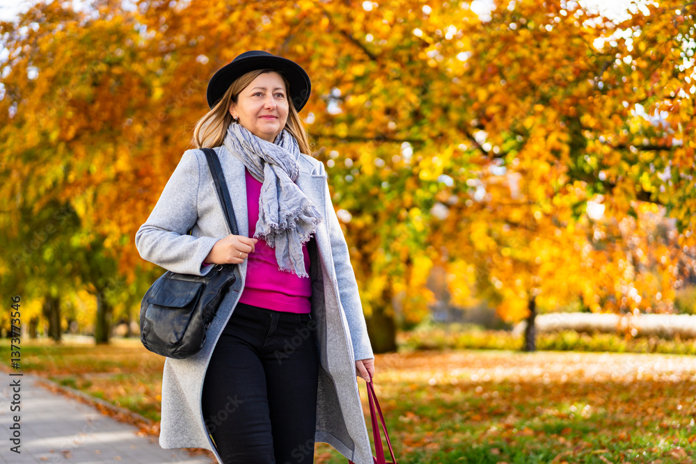 Beautiful middle aged woman in black brimmed hat walking in city park on autumn day. Front view
