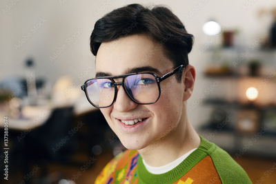 Portrait of young employee in eyeglasses smiling at camera while working in office