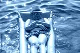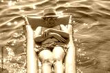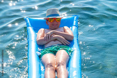 happy child basking in stylish hat and sunglasses enjoys luxurious beach day, young boy leisurely floating on inflatable raft while sipping refreshing beverage, summer vacation