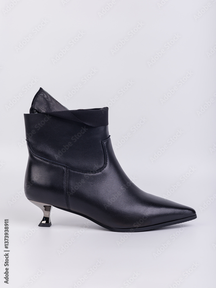 Elegant women's boots with heels made of genuine leather in black with fasteners on a white background. Stylish autumn women's shoes for every day