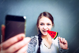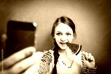 Beautiful young girl eating ice cream. studio.