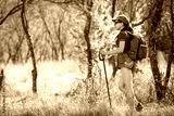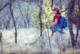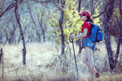 Young traveler with backpack standing on the big stones