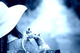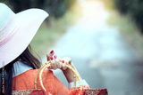 Portrait of pretty woman wearing white dress and straw hat in sunny warm weather day.