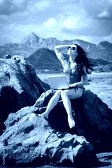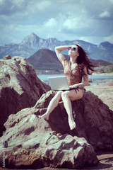 Happy woman enjoying beach relaxing joyful in summer by tropical blue water.