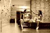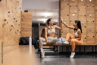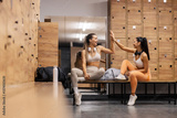 Smiling fit girls sitting in fitting room at gym and giving high five to each other.